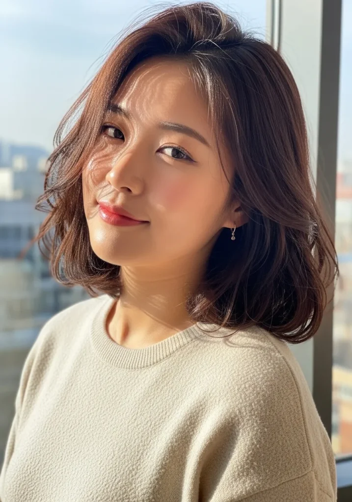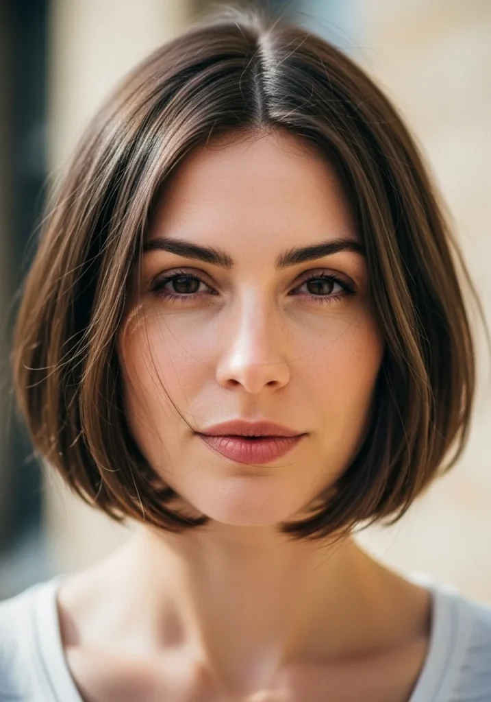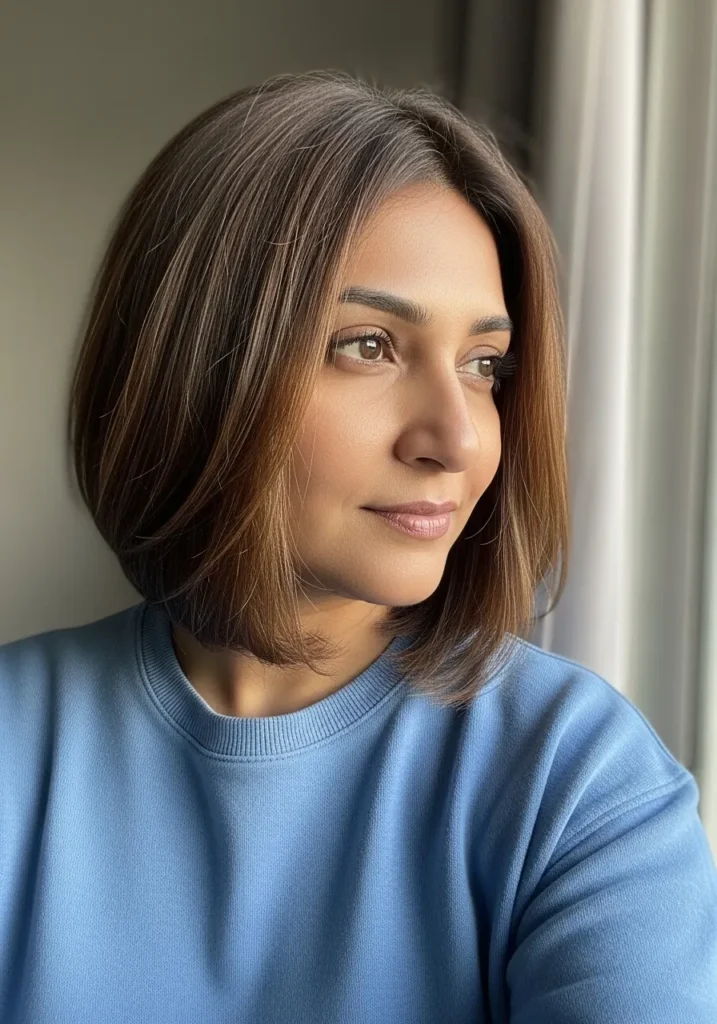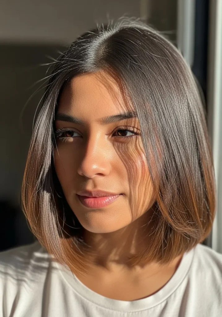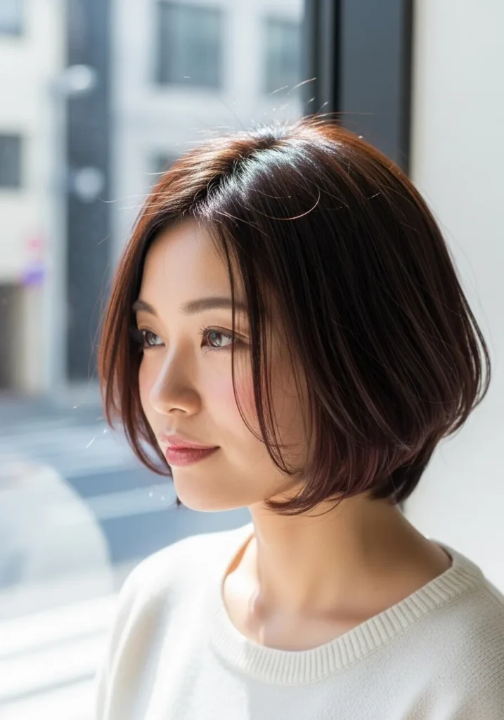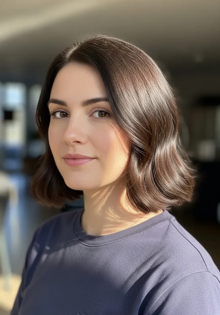 This bob has the perfect balance of sleekness and volume. The shiny, dark brown hair is cut into a bob that just hits the chin, with a subtle wave at the ends. The light coming through the window makes the hair shine, adding dimension to the sleek bob.