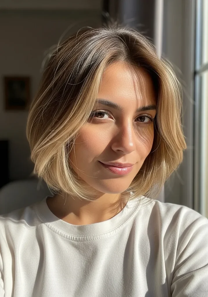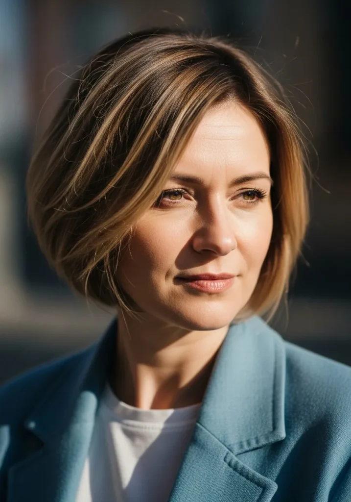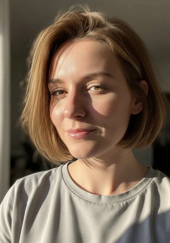 This style is great if you’re looking for something low-maintenance that still packs a punch. The smooth finish is so flattering, and I love how the soft light catches those tiny flyaways for a bit of natural texture. Plus, this bob just works so well with glasses, don’t you think?