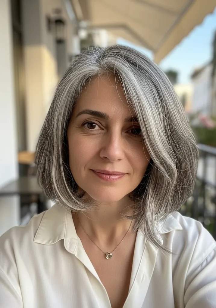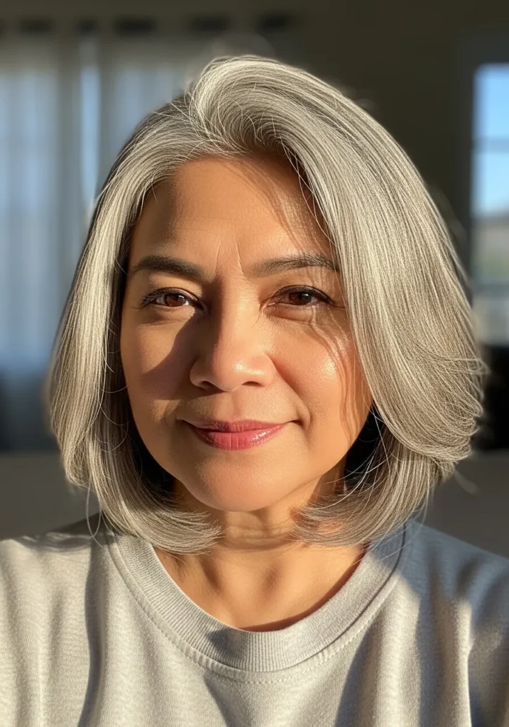 This elegant silver inverted bob has soft layers that fall just below the chin, framing the face in the most flattering way. The natural gray color is enhanced by the gentle waves, which give the hairstyle a bit of volume and movement. The sunlight brings out the shine, making it look fresh and radiant.