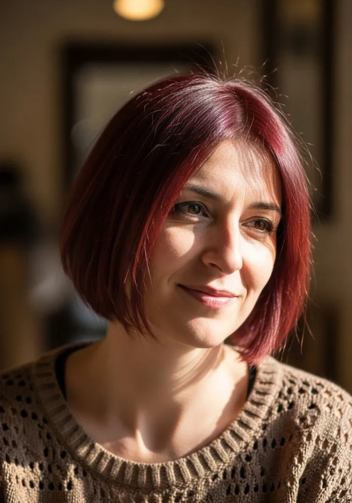 This short inverted bob features a deep, vibrant burgundy hue that adds a bold and edgy touch. The layers are soft and frame the face beautifully, with just enough texture to make it look natural. The sunlight accentuates the rich color, adding a glowing warmth to the hairstyle.
