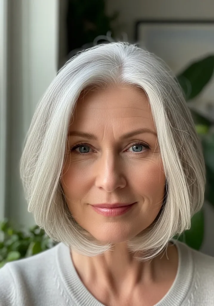 This silver-gray inverted bob has soft, sleek layers that fall just below the chin. The color is cool-toned, enhancing the shine and smoothness of the hair. The natural light shines on the hair, highlighting the smooth texture and giving it an elegant glow.