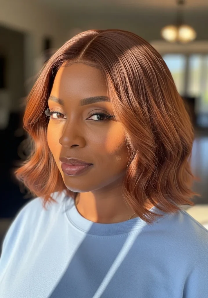 What I love most about this bob is how the copper color just brings the whole style to life. It’s bold and bright but still feels grounded and sophisticated. The waves add just the right amount of texture, giving it a fun, lived-in feel that’s perfect for any occasion.