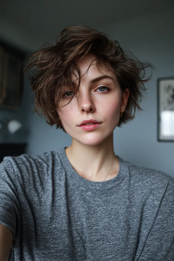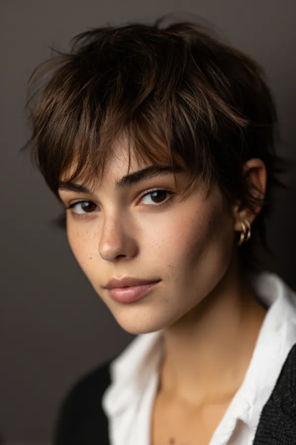 This short tomboy cut blends pixie length with soft shag layers, creating a light and airy shape around the head. The warm brown tone adds richness, while the feathered ends and gentle volume give it a relaxed and natural flow.