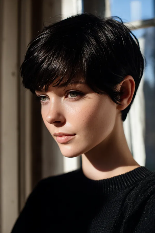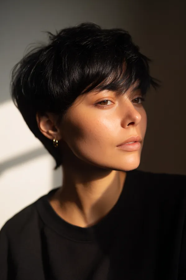 This short pixie features soft, feathered layers with a wispy fringe that lightly frames the eyes. The deep black shade adds a sleek touch, while the slightly longer top keeps the look relaxed and touchable.