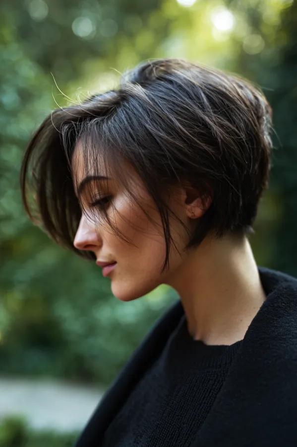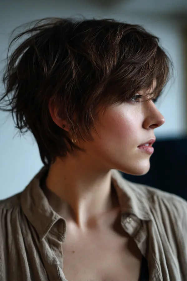 This short tomboy pixie features soft, airy layers with a lightly feathered fringe and a slightly longer nape. The warm brunette shade adds depth, while the tousled texture keeps the style looking relaxed and natural.