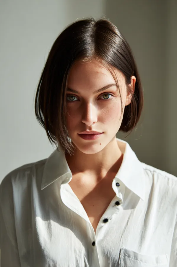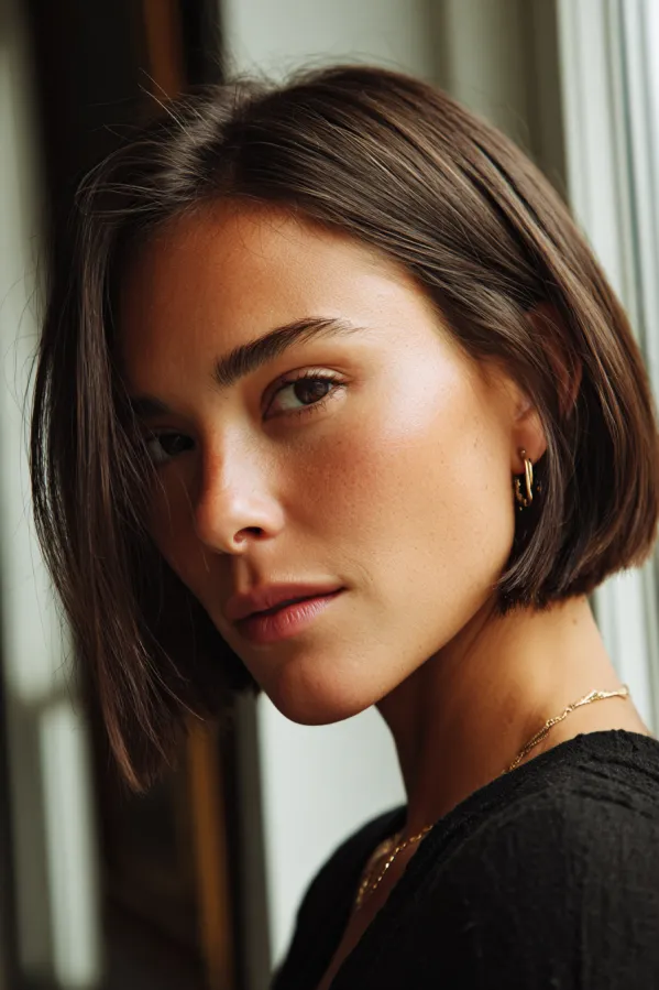 This short bob sits right at the jaw with a smooth, glassy finish and a clean side part that adds structure. The straight texture and rich brunette shade keep it sharp and minimal, with just a hint of softness around the ends.