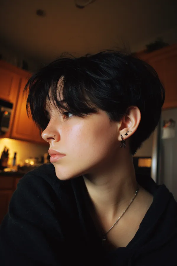 This pixie cut is short and neatly tapered with soft feathered layers that add gentle movement. The side fringe sweeps lightly across the forehead, and the deep dark tone keeps the overall look sleek and refined.