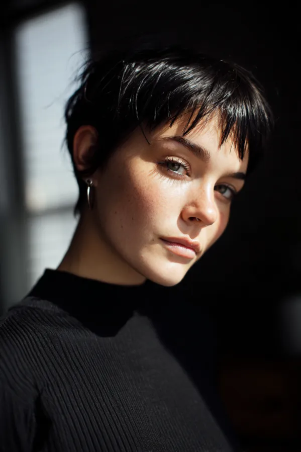 This ultra short pixie features choppy layers with a soft textured finish and a micro fringe that sits just above the brows. The deep black shade adds contrast and shine, while the slightly tousled top keeps the look from feeling too sharp.