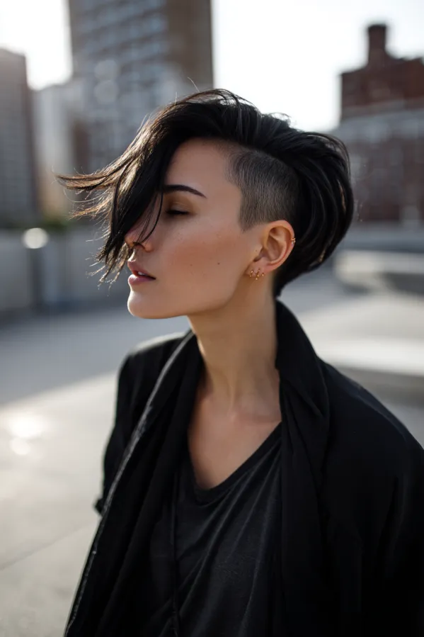 This bold pixie features a sharp undercut on one side with a longer top that sweeps dramatically across the face. The dark tone and smooth finish keep it sleek, while the contrast between shaved and long sections adds serious edge.