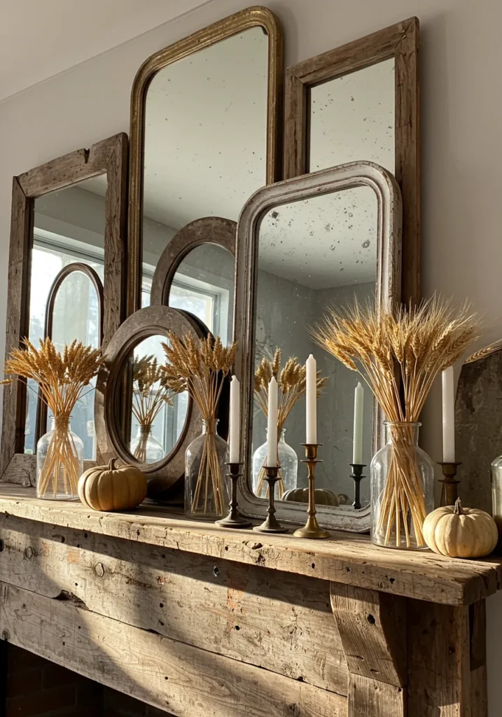 A rustic mantel becomes the star of the room with layered vintage mirrors that bring instant depth and drama. Clear glass vases filled with wheat stalks add soft texture, while brass candlesticks and pumpkins tie everything together.