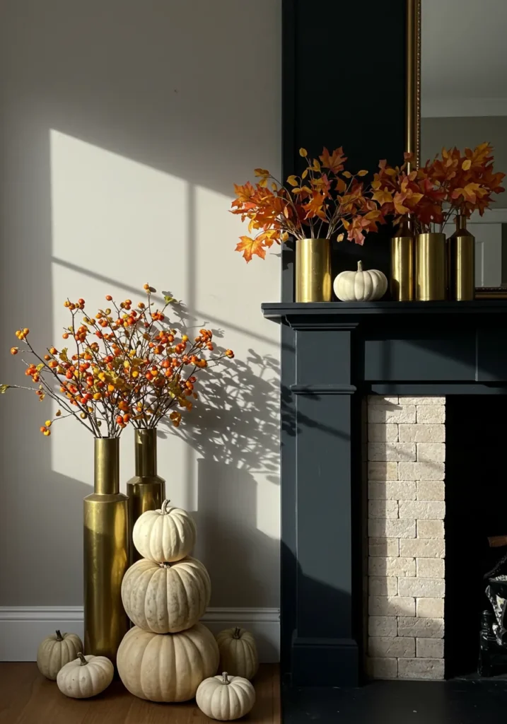 This striking black fireplace makes a statement with gold vases filled with autumn branches in fiery shades of red and orange. A tower of stacked white pumpkins sits nearby, adding a playful yet elegant twist to the display.