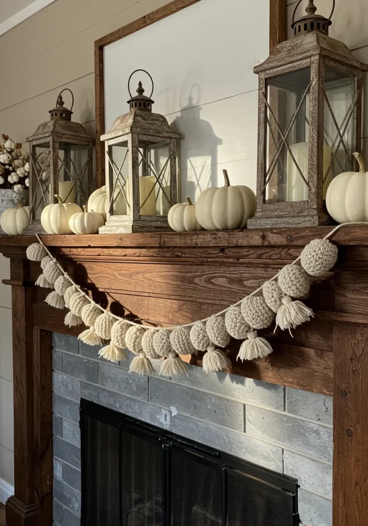 A rustic wooden mantel is styled with distressed lanterns, creamy pumpkins, and a chunky knit garland draped across the front. The mix of wood, metal, and soft yarn makes this design feel warm and layered.