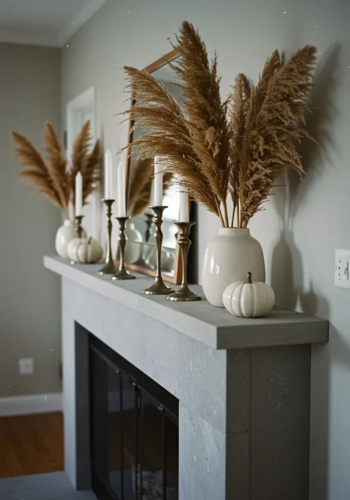 Neutral vases filled with tall pampas grass stand gracefully alongside slim brass candlesticks and small white pumpkins. The clean lines of the mantel and the airy textures keep the look minimal yet stylish.