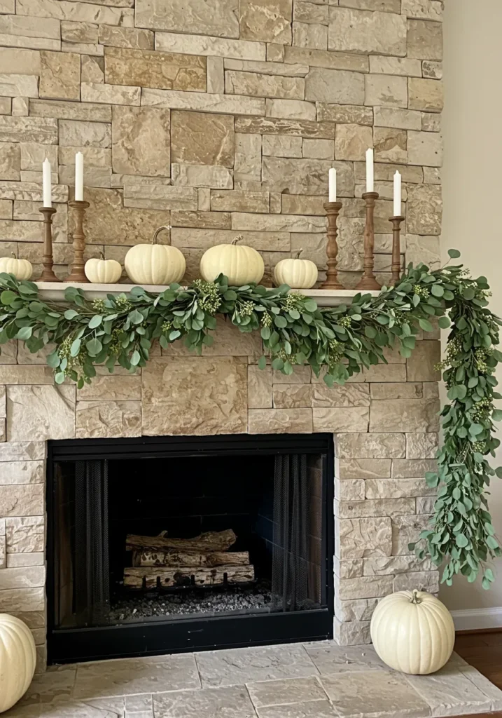 This natural stone fireplace is adorned with a cascading garland of fresh greenery dotted with cream pumpkins. Wooden candlesticks with white tapers frame the display, keeping the look classic and balanced.