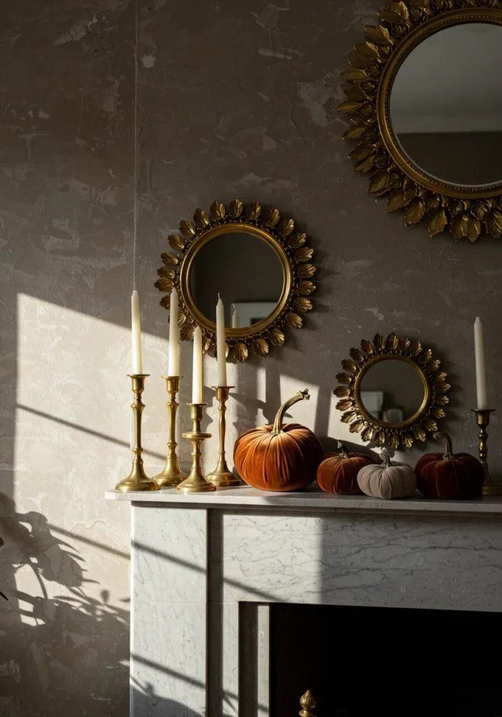 This white marble mantel looks so elegant with velvet pumpkins in warm autumn tones paired with tall golden candlesticks. Round gilded mirrors above reflect the light and bring a touch of glamour to the entire setup.