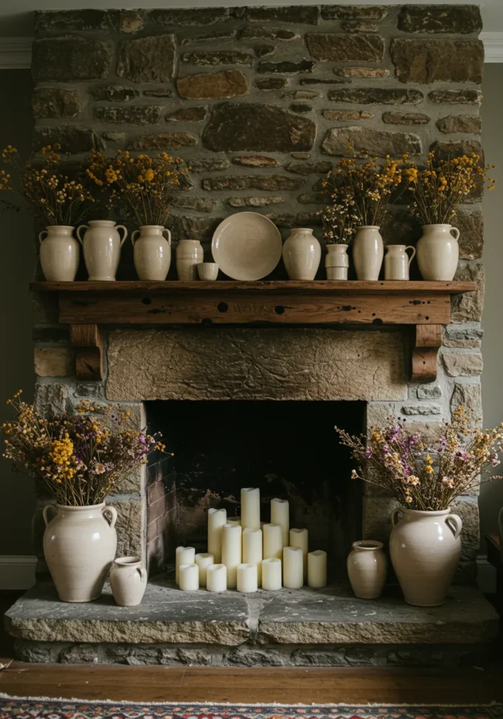 A rugged stone fireplace is paired with an assortment of creamy ceramic pitchers and jugs. Dried wildflowers peek out of the taller vases, while a cluster of pillar candles fills the hearth with soft glow.