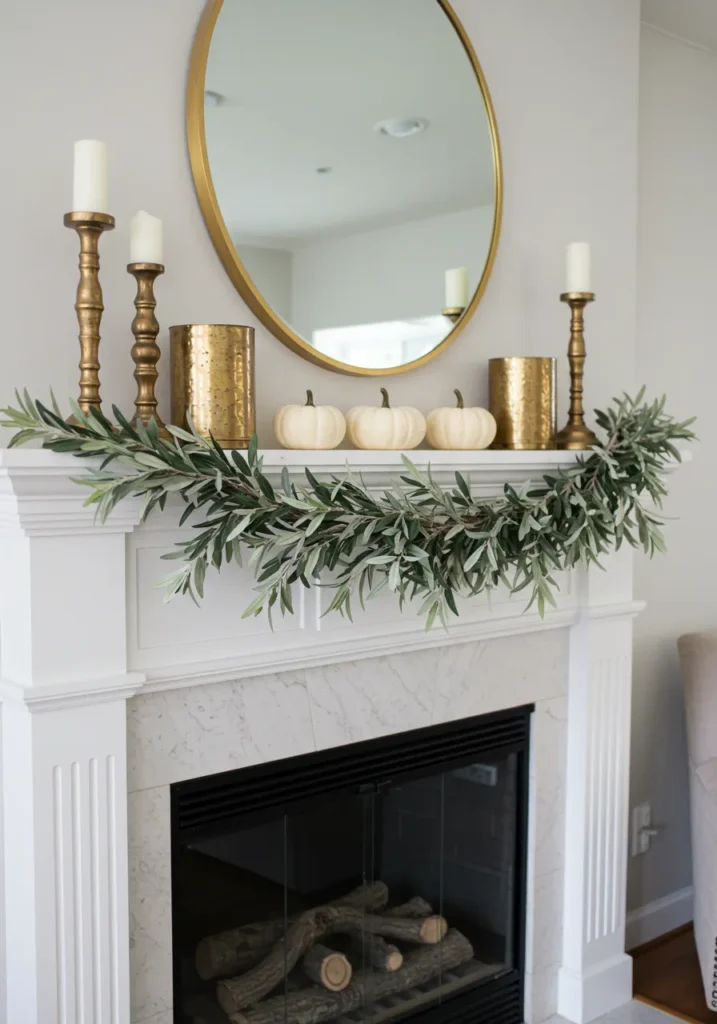 This white marble mantel gets a chic update with a soft olive garland, cream pumpkins, and tall gold candle holders. A round mirror above adds balance while reflecting the light across the room.