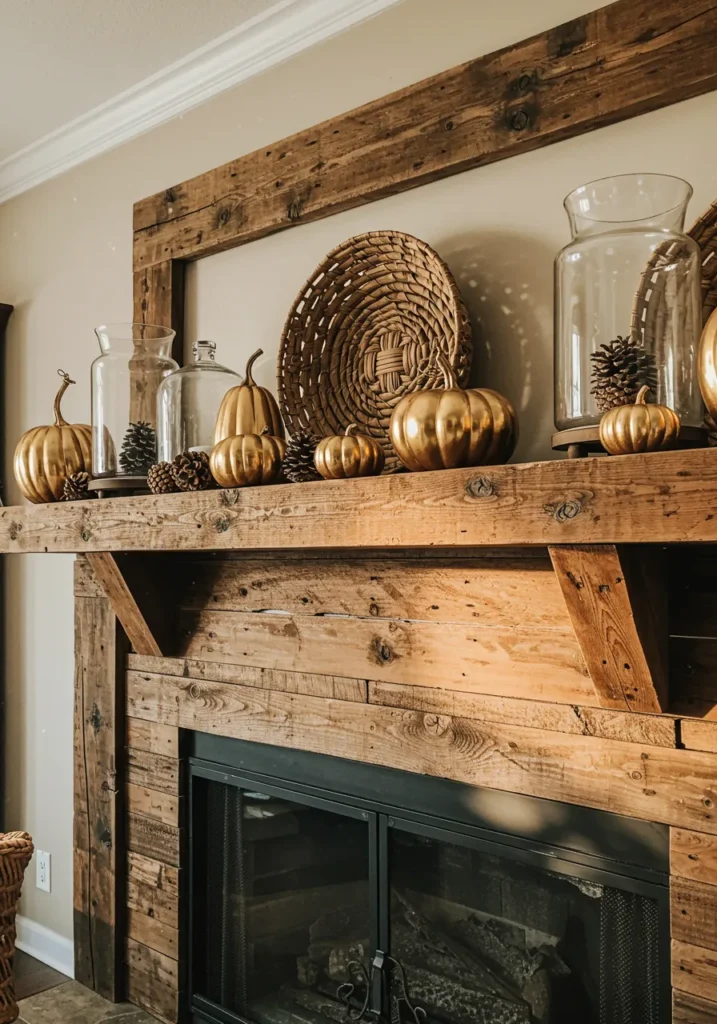 A rustic wooden mantel is styled with golden pumpkins, woven baskets, and pinecones for a layered harvest look. Glass vases add height, while the natural wood keeps it grounded and cozy.