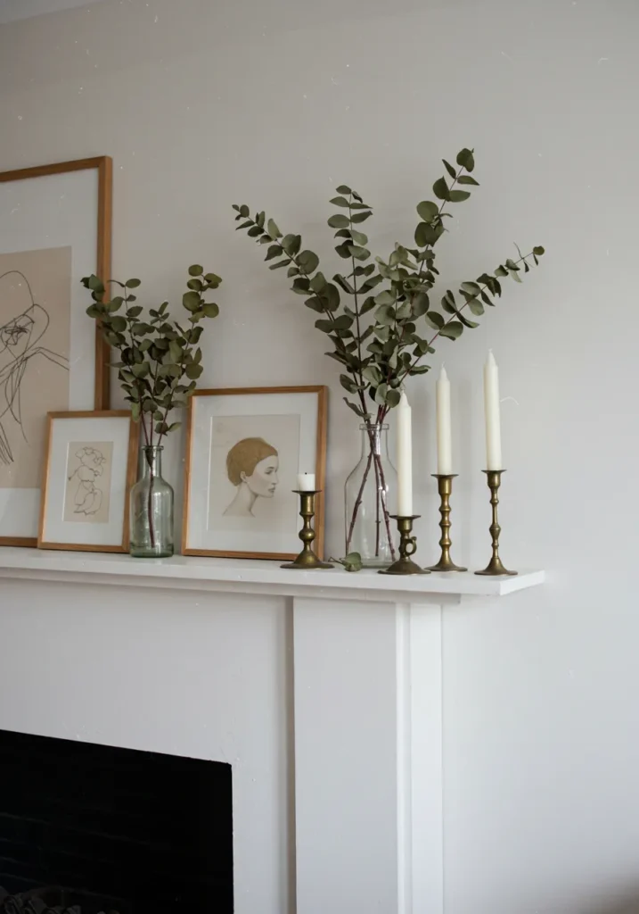 This mantel leans minimal with framed sketches layered casually against the wall, glass vases filled with eucalyptus branches, and brass candlesticks lined up for balance. The result is chic and understated.
