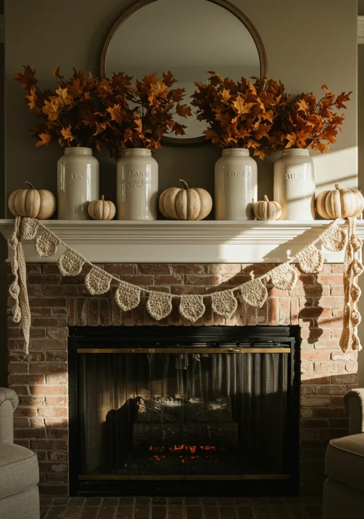 A brick fireplace is dressed with large white jars filled with orange maple leaves, flanked by soft neutral pumpkins. A chunky knit leaf garland drapes across the front, adding the sweetest handmade touch.