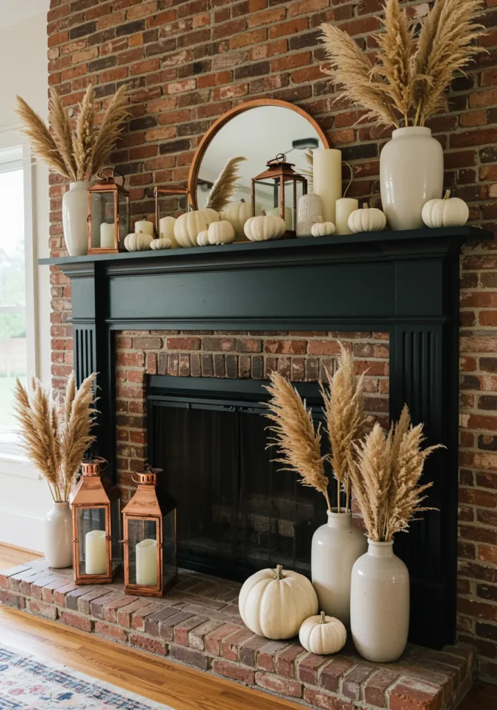 This brick fireplace gets a striking upgrade with a black mantel styled in soft neutrals. Pampas grass in oversized vases adds height, while copper lanterns bring warmth. White pumpkins lined up across the top create a polished Thanksgiving look.
