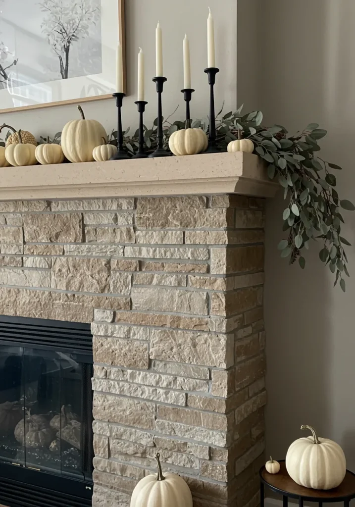 A stone fireplace gets a clean and modern refresh with neutral pumpkins, trailing eucalyptus, and bold black candlesticks. The contrast makes everything pop while keeping the palette soft and chic.