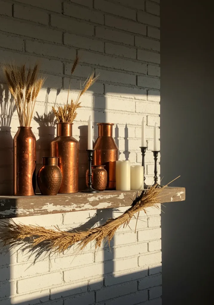 This mantel shines with a collection of hammered copper vases filled with golden wheat stalks. White candles in simple holders sit neatly beside them, and a rustic touch of dried wheat drapes across the front.