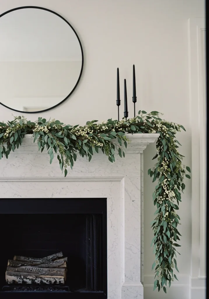 A sleek white mantel with a marble finish is topped with an overflowing eucalyptus garland dotted with delicate white berries. Black taper candles in matching holders create a dramatic, modern edge.
