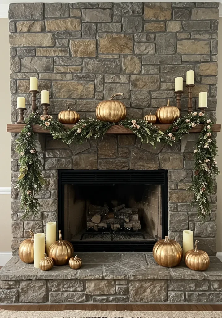 This stone fireplace becomes the star of the room with gleaming gold pumpkins, layered garlands of greenery, and wood-toned candle holders. Extra candles on the hearth give it a cozy, glowing look.
