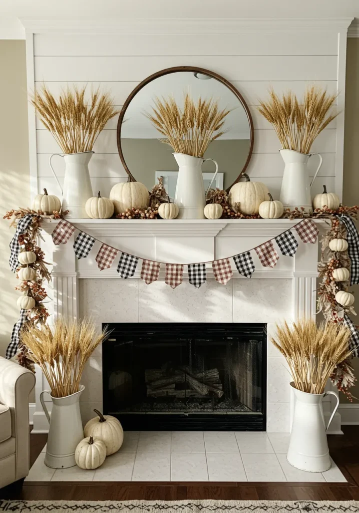 A white shiplap mantel is decorated with pitchers of golden wheat, stacks of neutral pumpkins, and a checkered banner in warm fall tones. Garlands with berries and pumpkins spill down the sides for extra charm.