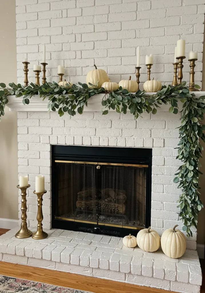 This white-painted brick fireplace is dressed with cascading greenery, soft cream pumpkins, and brass candlesticks holding tall white candles. A few pumpkins on the hearth carry the look all the way down.