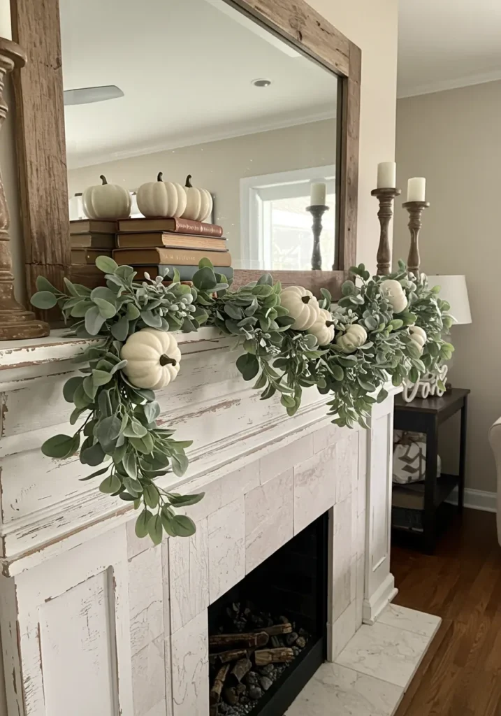 A weathered white mantel takes on a whimsical vibe with a garland of soft greenery woven with cream pumpkins. Stacked books, rustic candle holders, and layered mirrors above complete the farmhouse-inspired look.