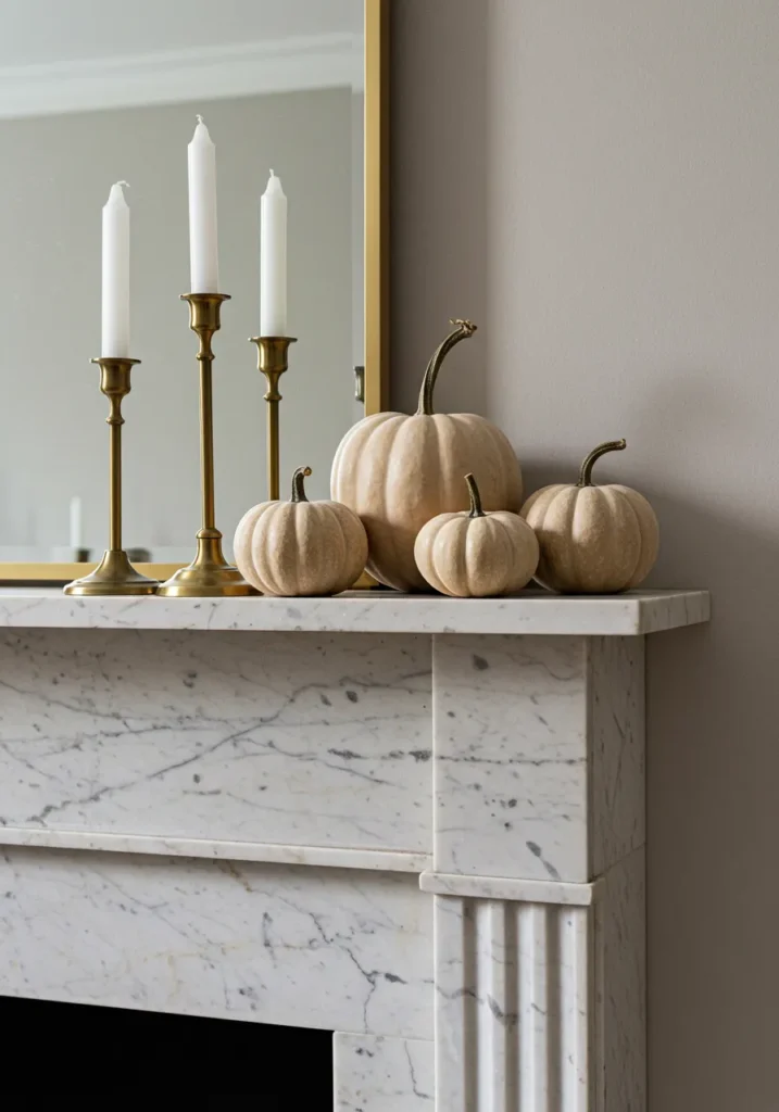 Here, a marble fireplace is dressed with golden candlesticks and a collection of neutral pumpkins. The clean lines of the stone and the soft metallic accents make the whole arrangement feel timeless and chic.