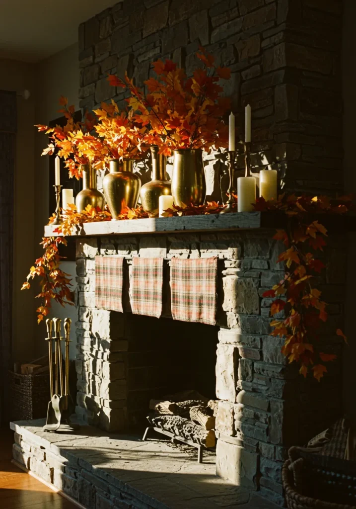 A rugged stone fireplace becomes the perfect canvas for a bold Thanksgiving look. Golden vases spill over with fiery fall leaves, while candles and plaid accents add cozy layers. The mix of natural textures makes the whole scene glow.