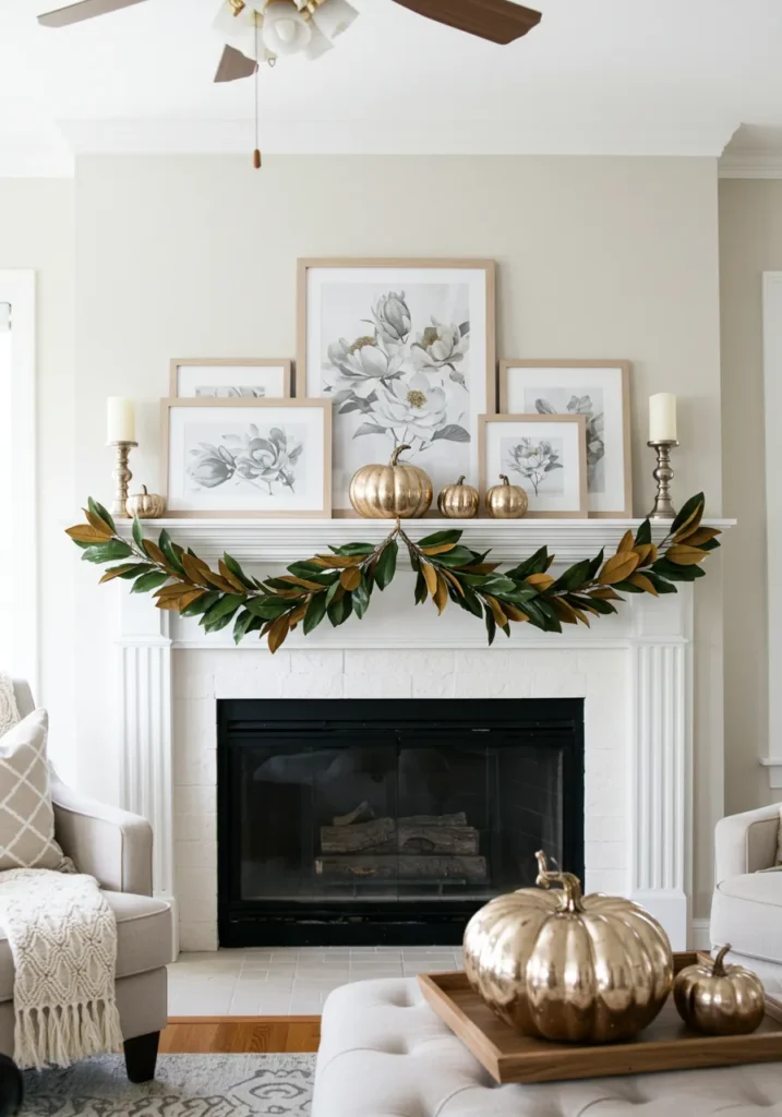 A crisp white mantel is styled with glossy gold pumpkins, tall candles, and a garland of magnolia leaves draped with intention. Framed floral art above ties in perfectly, giving the space an elegant yet approachable charm.