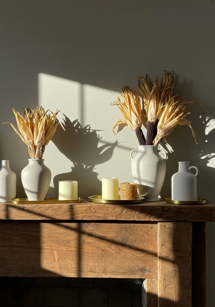 This mantel keeps things simple and earthy with neutral ceramic vases holding dried corn husks and deep-hued corn cobs. A few pillar candles on golden trays finish the look, letting the warm afternoon sunlight cast playful shadows across the wall.
