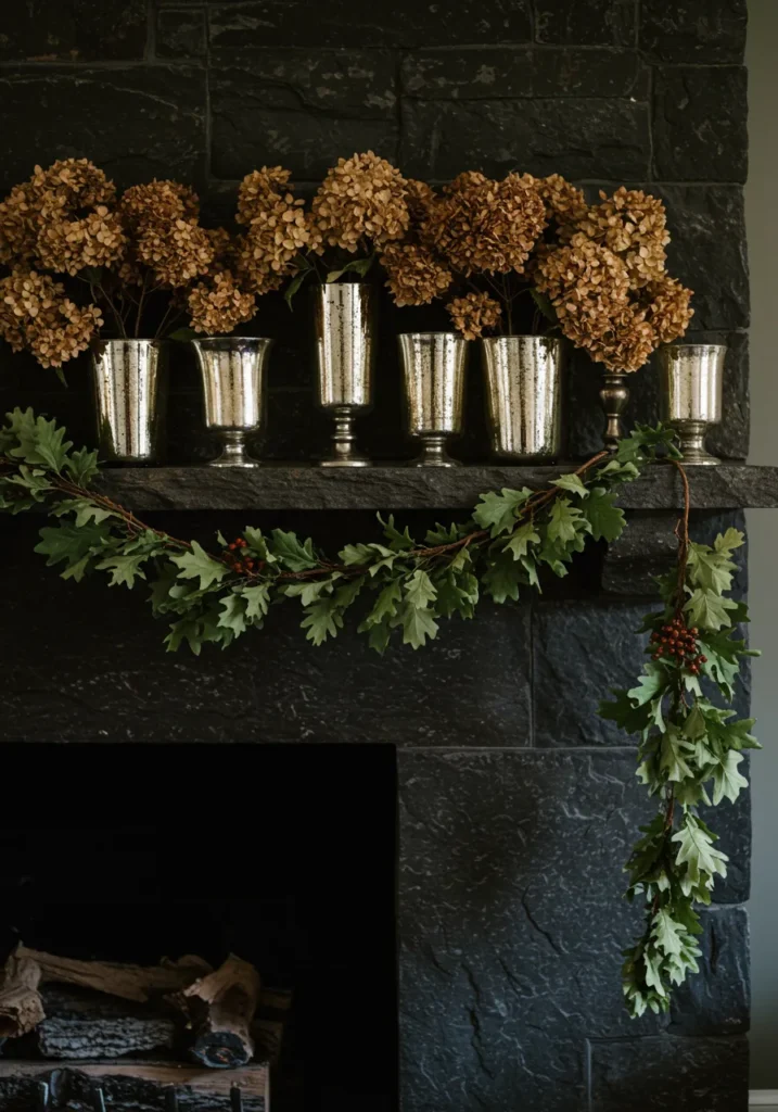 A dark stone mantel gets dressed with silver-toned vases holding dried hydrangeas in soft golden hues. A lush green garland with hints of berries drapes across the front, adding balance and movement to the design.