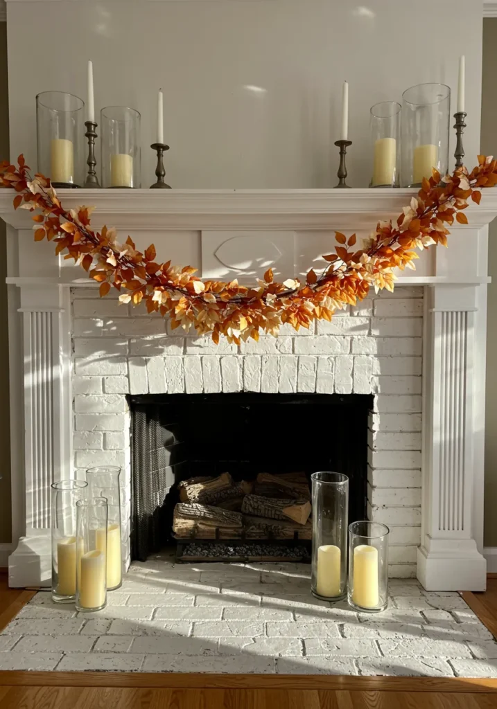 Here, a crisp white fireplace is brought to life with a bold garland of orange and cream leaves. Tall glass hurricanes and candlesticks add height, while simple pillar candles glow softly on both the mantel and hearth.