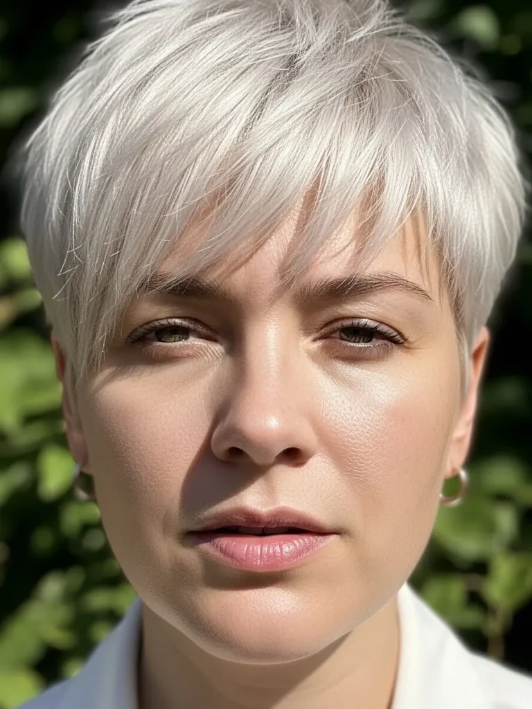 This platinum pixie has a short clean outline with soft choppy layers that create a feathered texture. The fringe falls lightly forward and blends seamlessly into the top while the bright shade adds a bold modern edge. The hair stays thick and structured but still has movement.