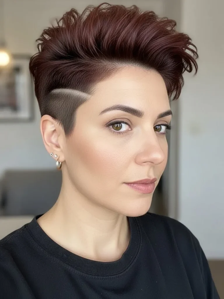 This bold pixie features a rich burgundy top with thick textured volume swept upward. The sides are shaved clean and carry a sharp line design that adds instant character. The contrast between the smooth shaved section and the lifted top gives the whole look a strong modern vibe.