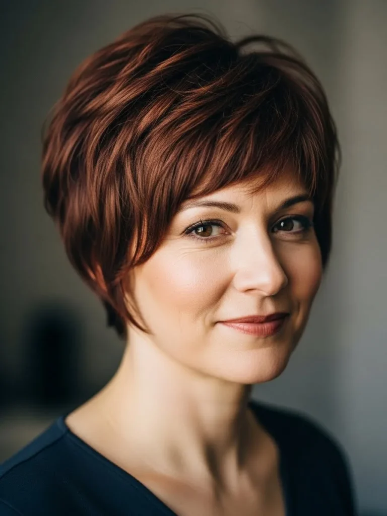 This pixie has layered auburn hair that brings beautiful warmth and dimension. The shape stays soft around the sides and the fringe blends seamlessly into textured layers that sit gently around the face. The thickness of the hair gives the cut a full rounded silhouette.