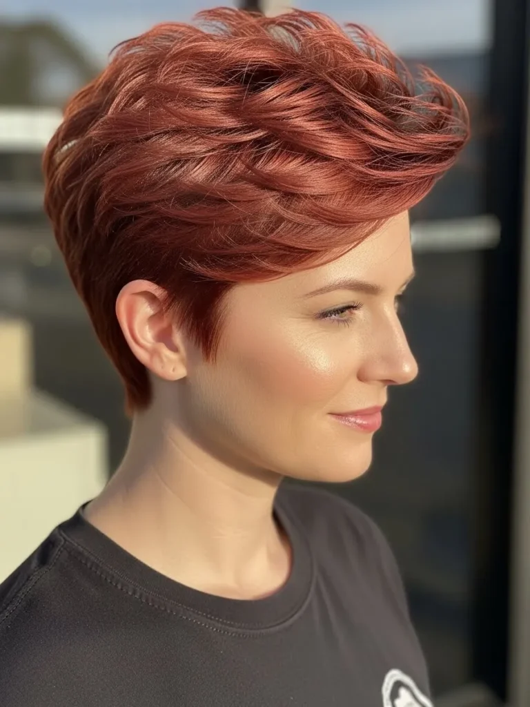 This copper pixie is full of feathered layers that sweep back in a soft windswept shape. The color is warm and vibrant which makes the texture stand out even more. The sides stay neatly tapered while the top carries most of the airy movement.