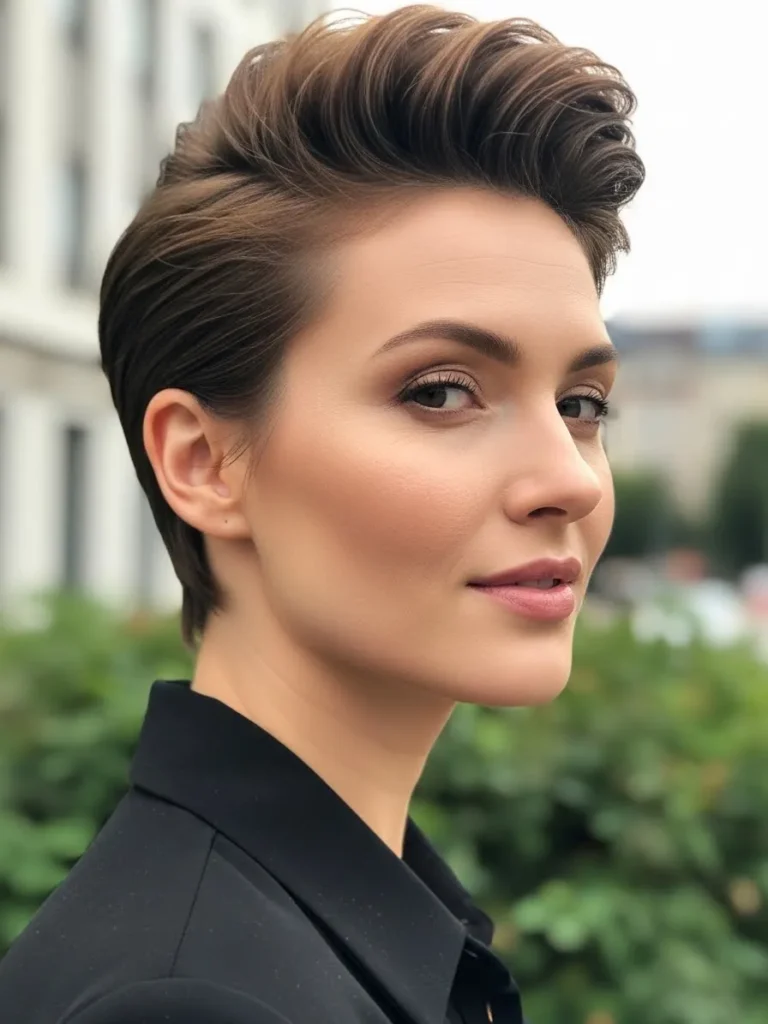 This cut is all about height through the crown with thick layers brushed upward to create a soft yet structured shape. The sides stay short and neat while the warm brown color adds richness to the overall look. The volume gives the pixie a fun silhouette that feels lively and full of personality.