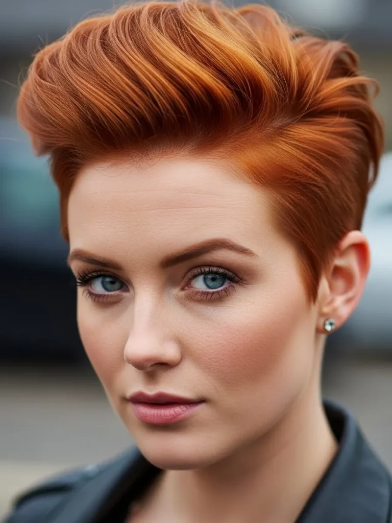 This striking pixie carries a vibrant copper color that makes the thick hair look even fuller. The top is styled up and back with plenty of volume while the sides stay cropped and clean. The smooth texture lets the color shine and the lifted shape gives the cut a strong confident edge.