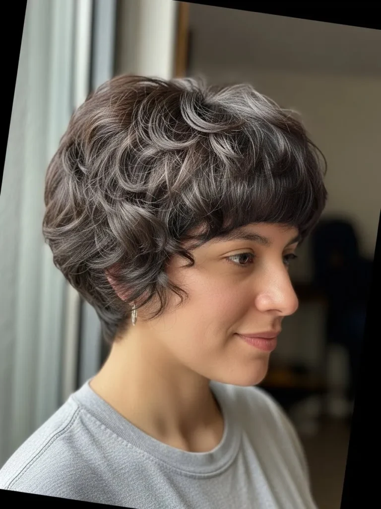 This silver pixie has short layered sides and a fuller top that creates gentle movement through thick hair. The blend of charcoal and silver tones adds depth and dimension while the soft sweeping fringe frames the face beautifully. The style feels refined yet modern with a natural flow.
