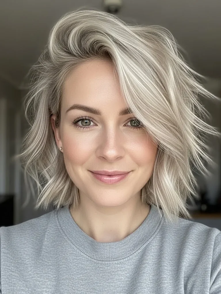 Textured Ash Blonde Bob With Side Swept Lift