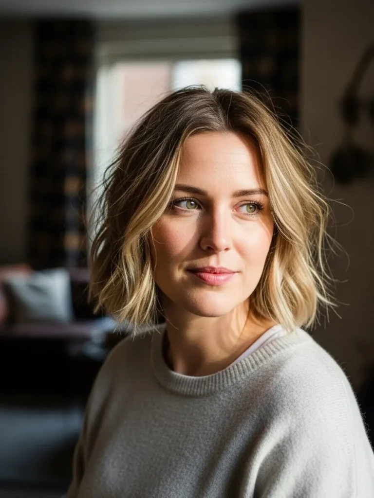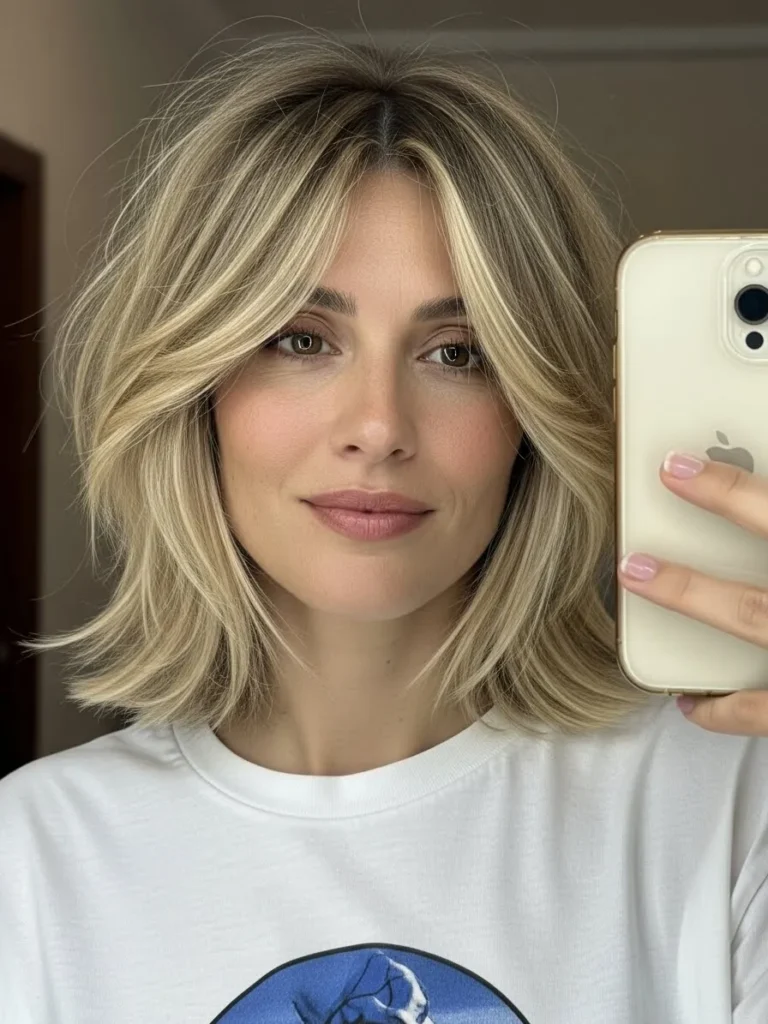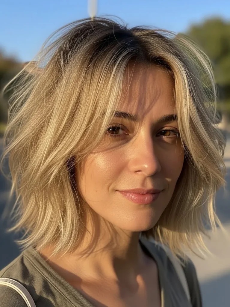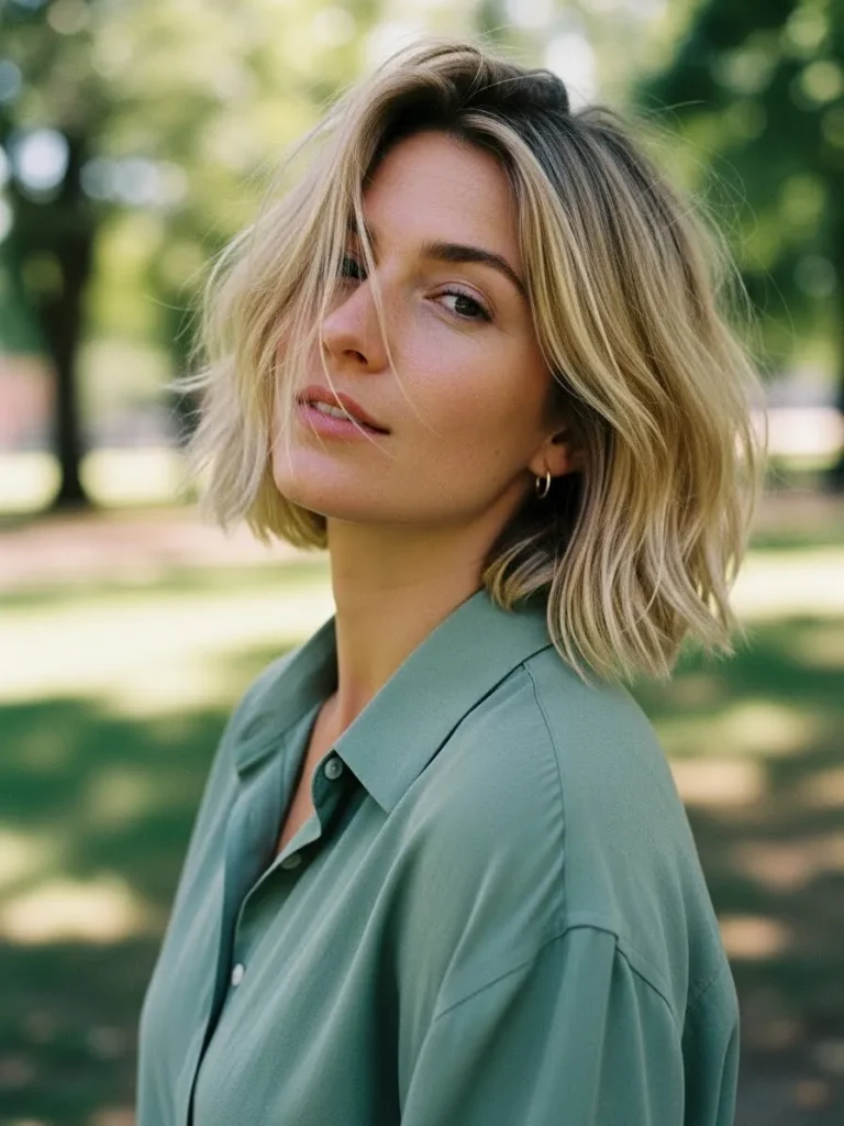 This bob blends warm ash blonde tones with soft highlights that bring out the textured choppy layers. The length sits near the shoulders with loose waves that add bounce and movement. The face framing pieces brighten the front and the natural root shade keeps the style grounded and modern. The overall effect is soft and flattering.