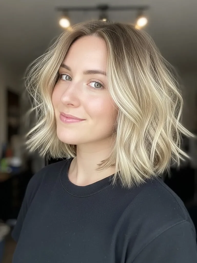 Warm Ash Blonde Wavy Bob With Soft Dimension