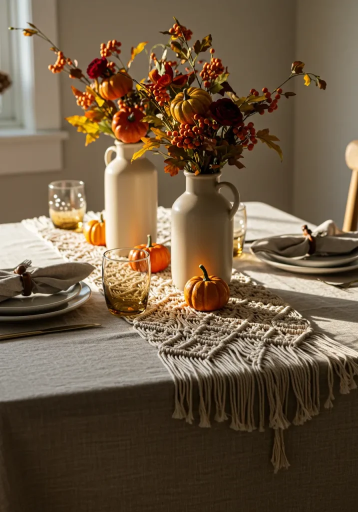 This table setup feels effortlessly festive. The macramé runner, paired with neutral linens and small pumpkins, creates that perfect blend of texture and warmth. The soft light adds a gentle glow that feels so comforting and intimate.
