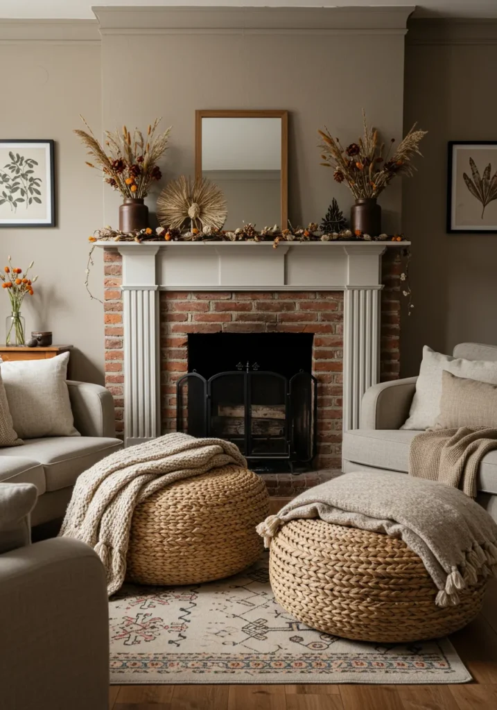 This living room radiates autumn comfort. The brick fireplace brings natural texture, while the dried florals, woven poufs, and soft throws make the space feel layered and lived-in. The earthy tones create that grounded, cozy atmosphere that defines boho style.